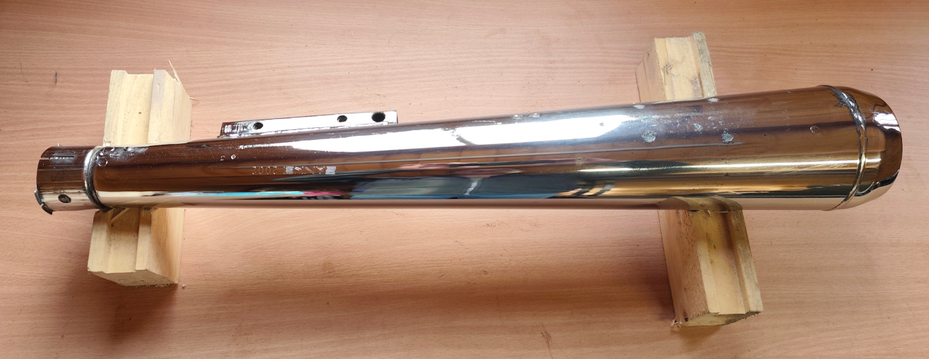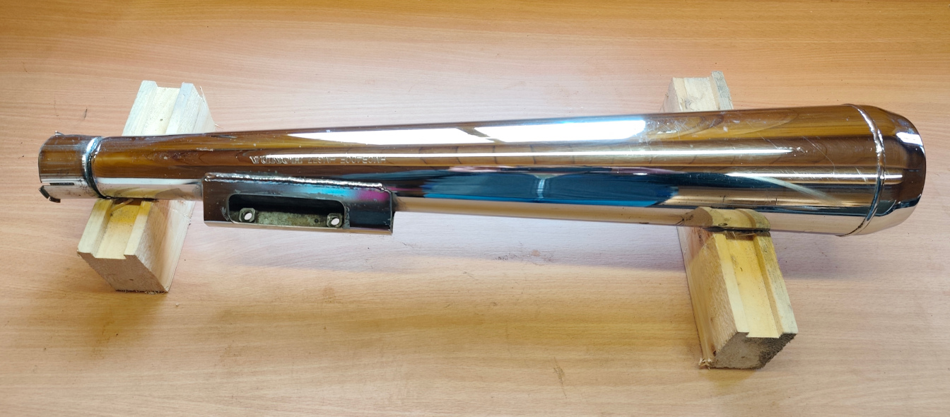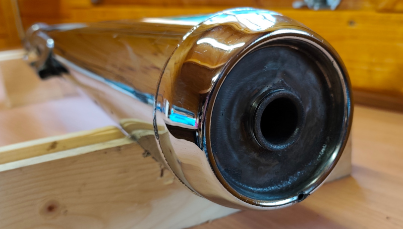 Das Ende des Schalldämpfers (Auslaß) mußte ich mit einer kleinen Drahtbürste bearbeiten um den Rost zurückzudrängen. Dabei wurde zwar auch Chrom beschädigt, da die Fläche aber wie im Original mit Auspufflack behandelt wird, ist dies nicht weiter störend: