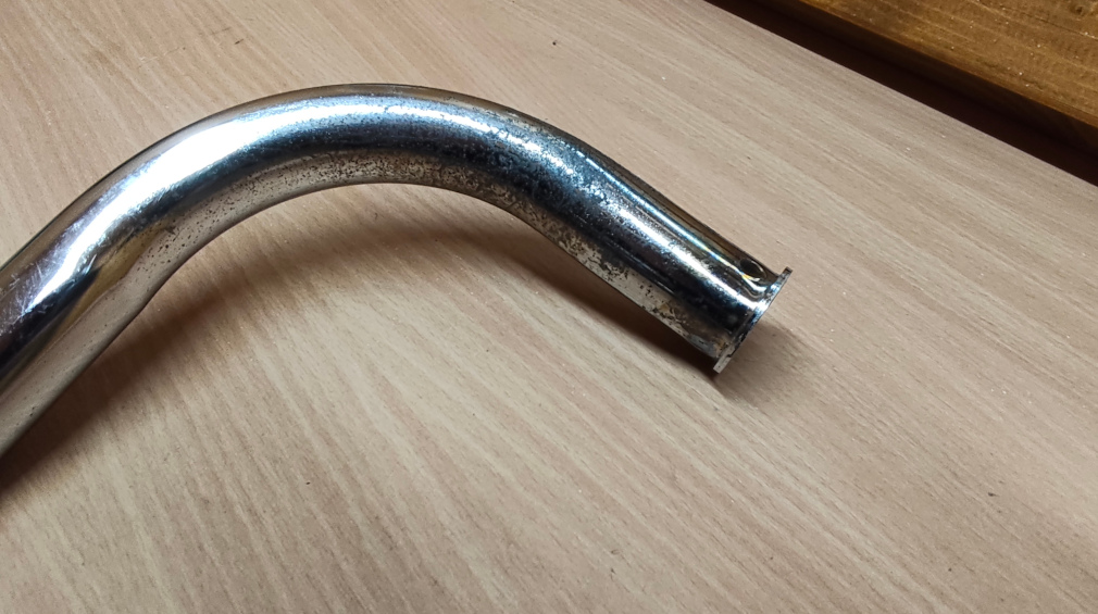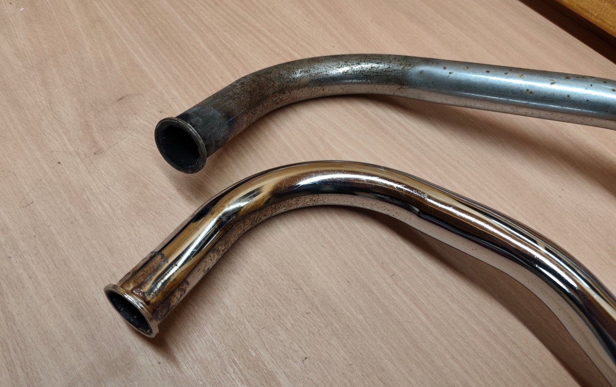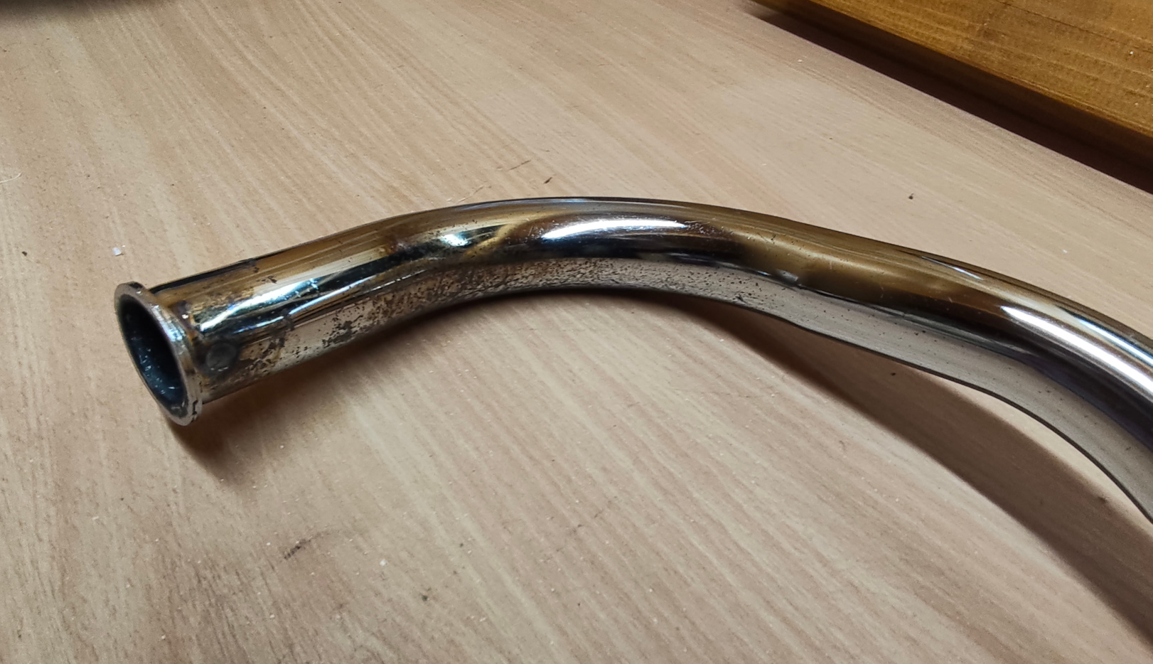 Zum Zylinderauslaß waren stärkere Rostansammlungen, hier wurde die meiste Zeit aufgewendet. Völlig entfernt habe ich diese nicht, da die Chromschicht ohnehin dünn ist und bei weiterer Politur zwar die Rostpickel nicht mehr sichtbar wären, die Chromschicht aber auch nicht mehr vorhanden.